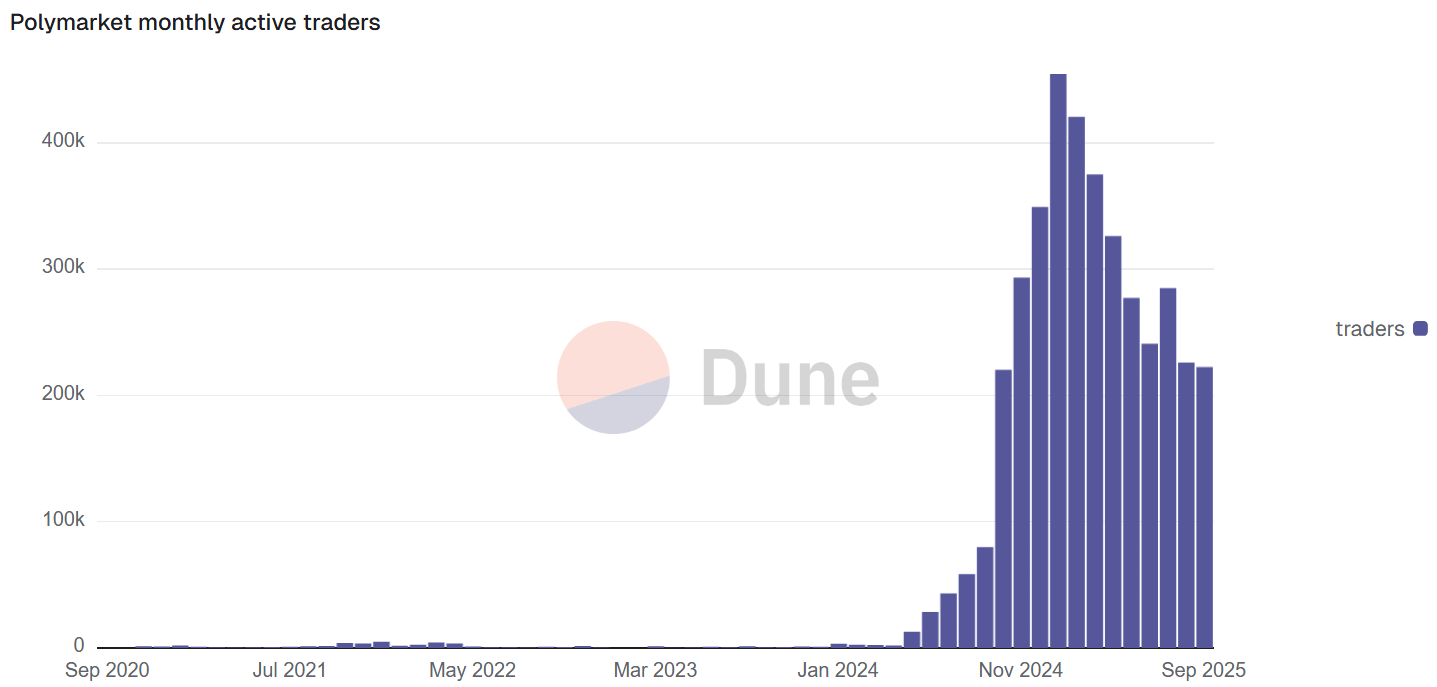 According to Dune Analytics, active traders on Polymarket have declined from 400,000+ monthly at peak to around 225,000 today. To put this in perspective, Coinbase has approximately 8.7 million monthly transacting users and Robinhood has over 14 million—making Polymarket roughly 2.5% and 1.6% of these platforms' user bases respectively, and declining as a relative percentage.