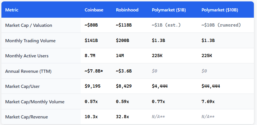 At $1B, the valuation math works—kind of. Polymarket trades at a discount per user and roughly matches Coinbase and Robinhood on market cap-to-volume ratios. Polymarket’s zero revenue is concerning, but for early-stage platforms, investors typically bet on the ability to flip the monetization switch once scale is achieved, and I can buy into that.