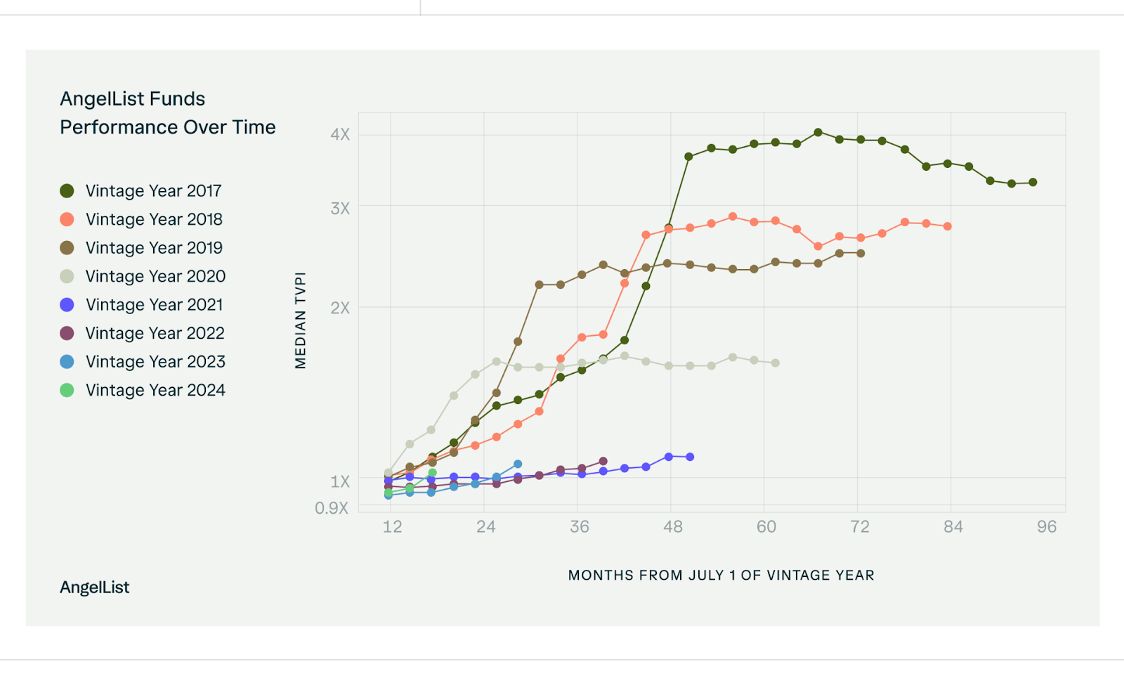 Median TVPI over time by vintage year. The 2021-2023 vintages (bottom cluster) barely move off the 1.0x line.