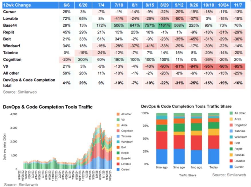 Competitive threats are intensifying: AI model providers (Anthropic, OpenAI, Google) and new startups (Replit, Bolt, Base44) have launched competing tools and are heavily investing in the space. Category compression could erode Lovable's moat rapidly. The Similarweb data showing Lovable's recent growth deceleration suggests this may already be underway.